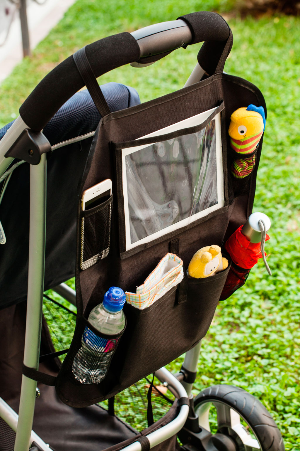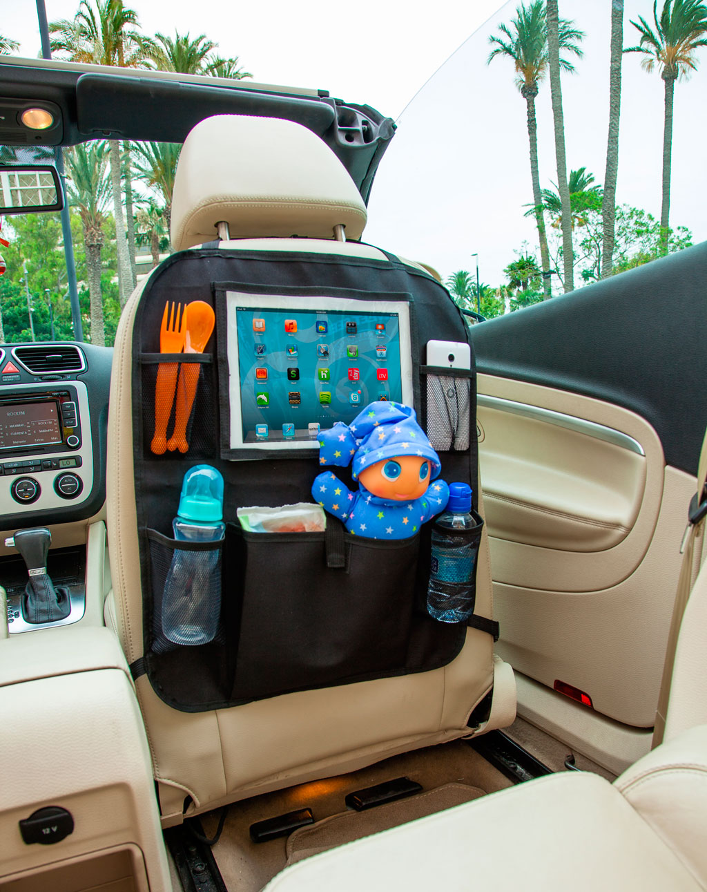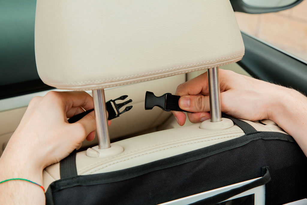 Backseat car organizer to have all the things you need on hand while traveling with your baby by car. It is also 2 in 1 since you can take it both in your car and in your stroller. Universal system fits most seat backs. Easy to install with adjustable straps and buckles.