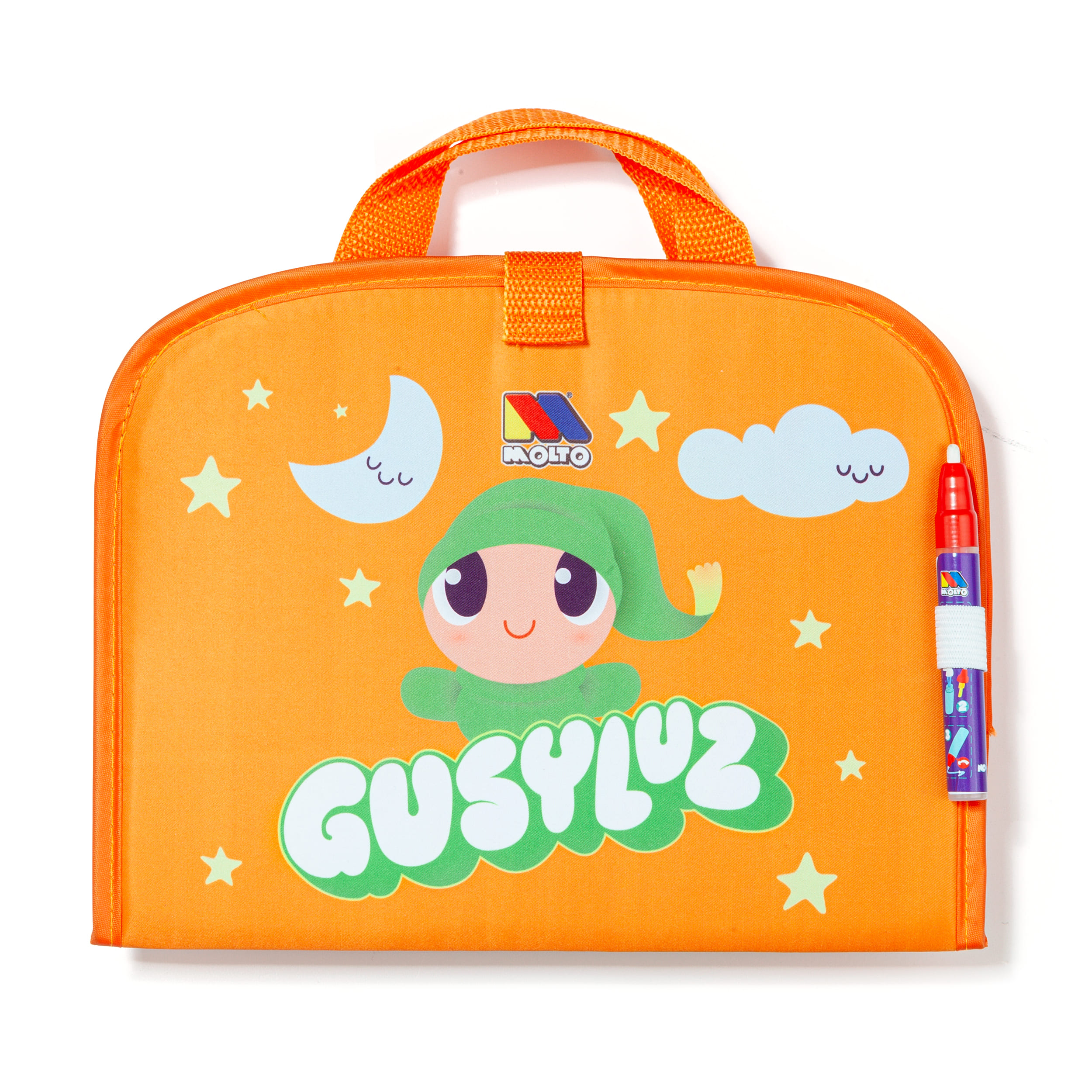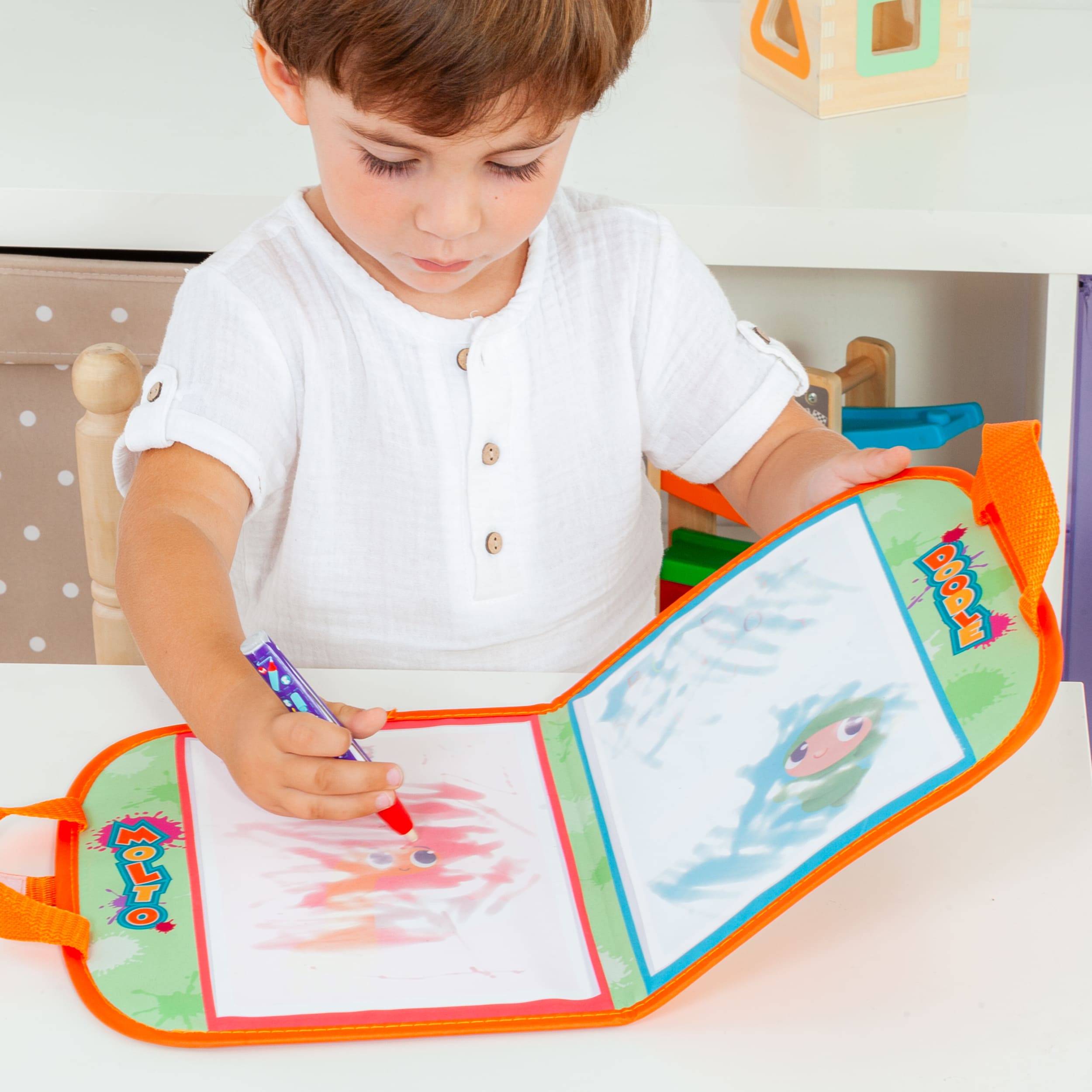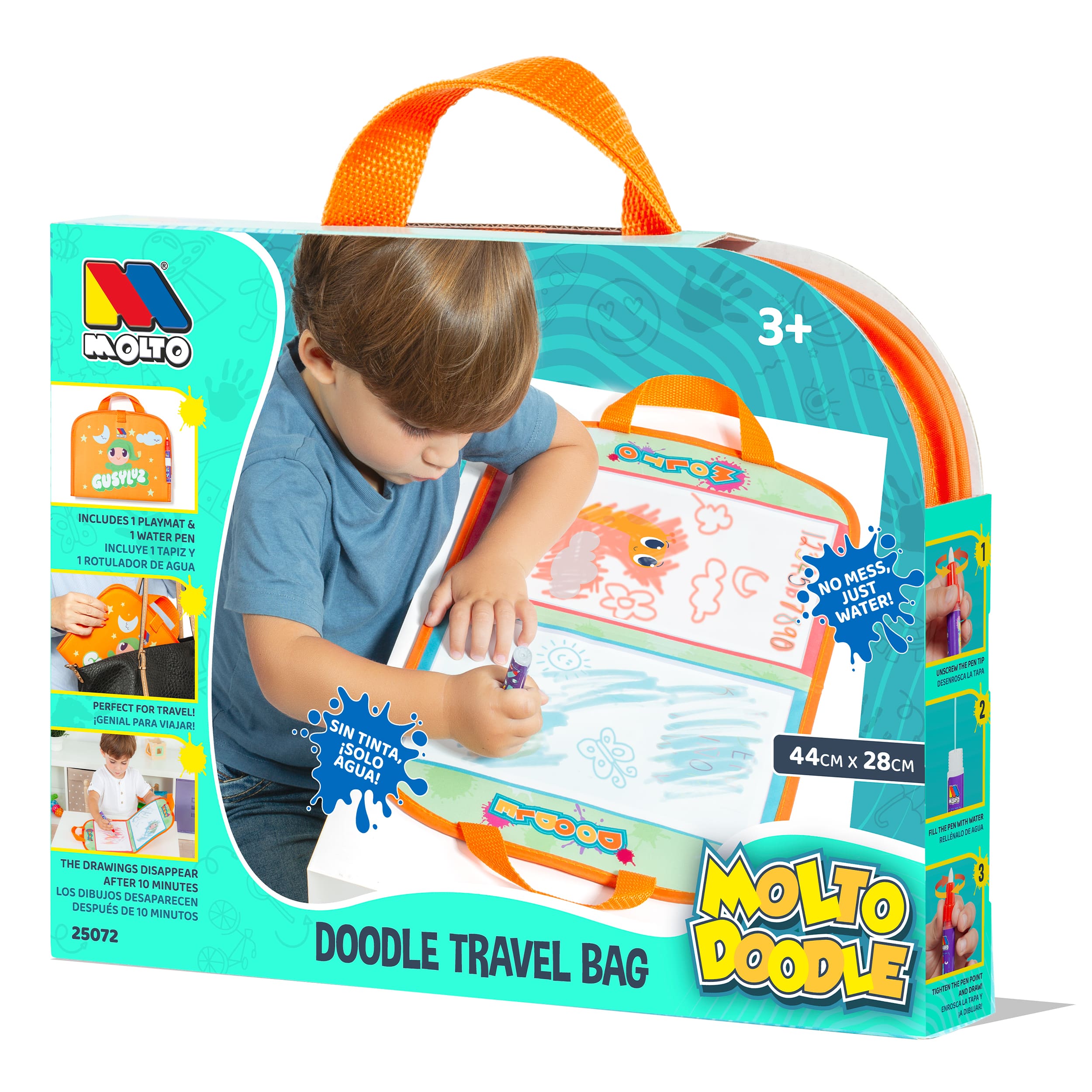 Mess-free drawing fun with the Travel Molto Doodle Case! This portable mat lets little ones explore their creativity with no ink and no stains. Just fill the pen with water and start drawing! The images magically disappear after a few minutes, ready to begin again. Perfect for travel, restaurants, or any waiting time, thanks to its foldable suitcase-style format with handle.