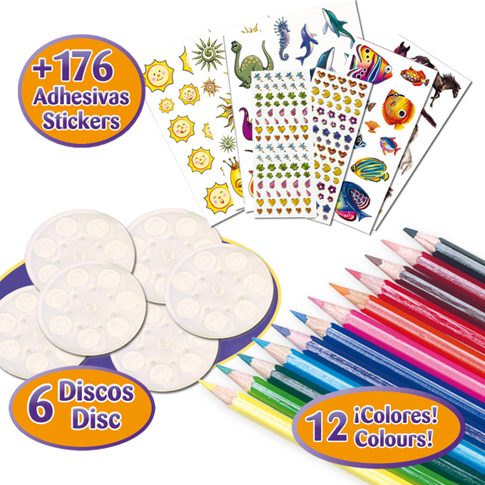 Incluye 6 discos con más de 40 diseños únicos, 12 lápices de colores, 60 tattos y más de 176 pegatinas.