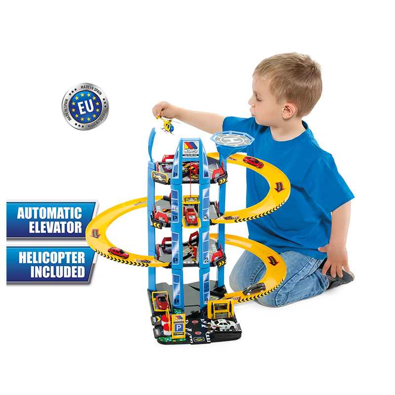 Estupendo garaje de 4 pisos, fuerte, resistente, fácil de montar y mucha estabilidad. Contiene ascensor, lavado de coches, engrase, estación de servicio y muchos accesorios.