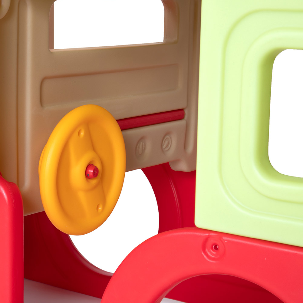 ¡Deslizarse, subir y arrastrarse! Fomenta el juego de roles activo en este centro de juegos al estilo de los vehículos todoterreno.