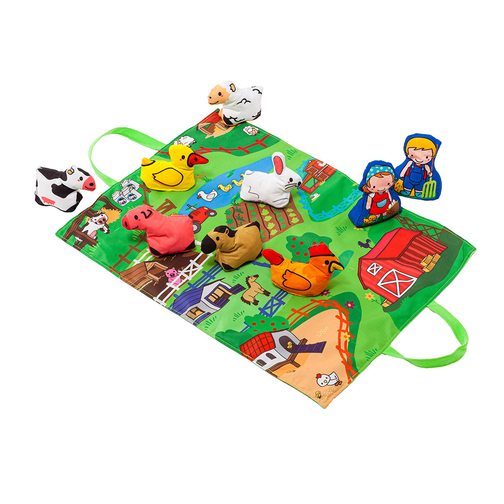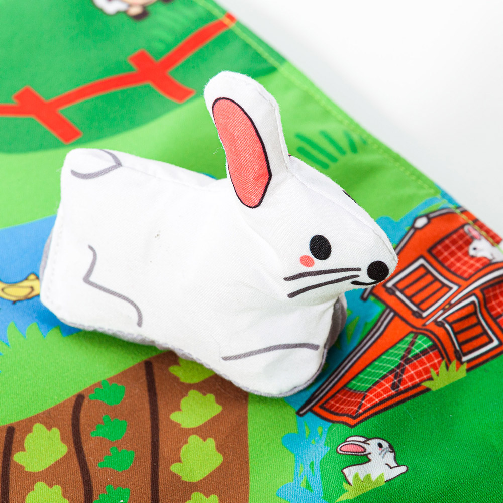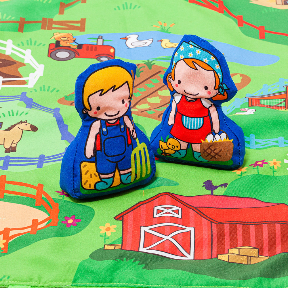 Tapiz de juego de tela con el dibujo de tu granja, con Lily, Marc y sus 7 animales, coloca a cada animal en su espacio, aprende sus nombres, toca y experimenta con sus diferentes sonidos y colores y una vez que termines recoge tus juguetes en el mismo tapiz que se convierte en bolsa.