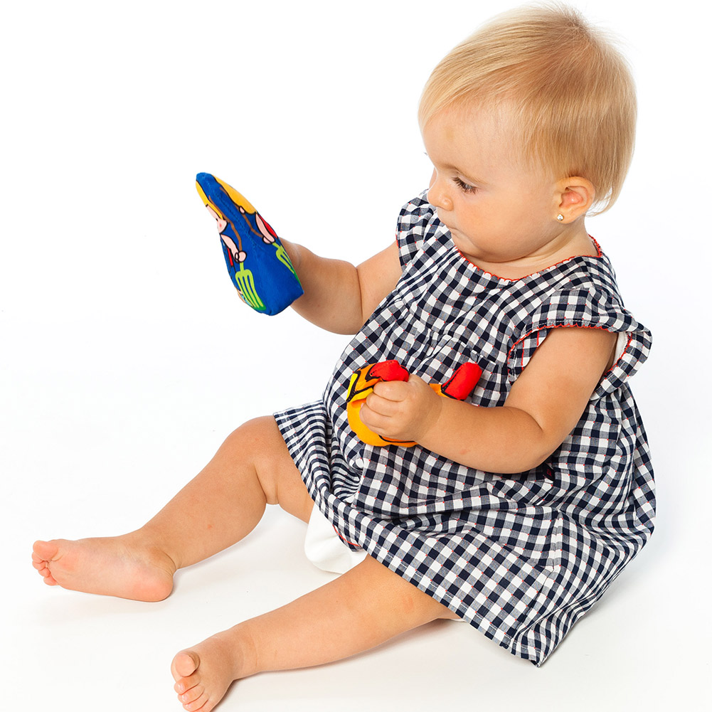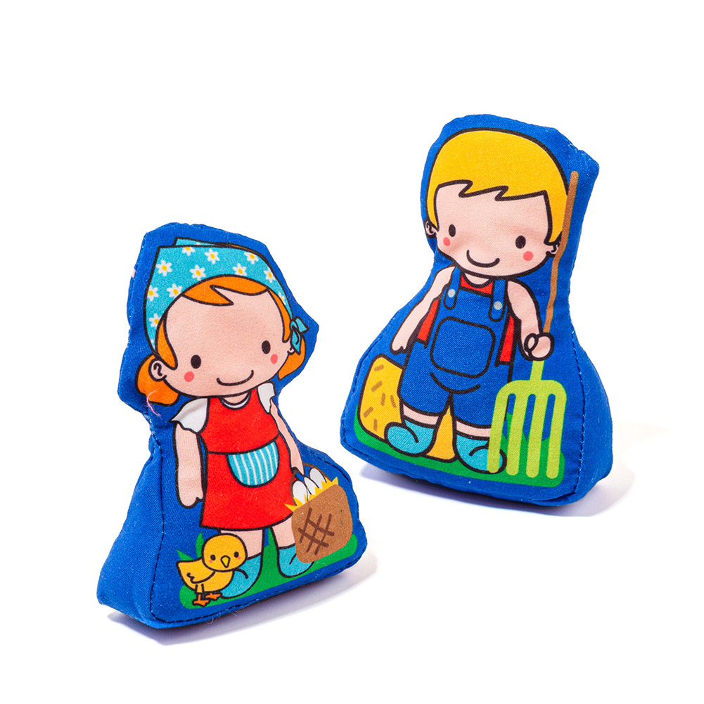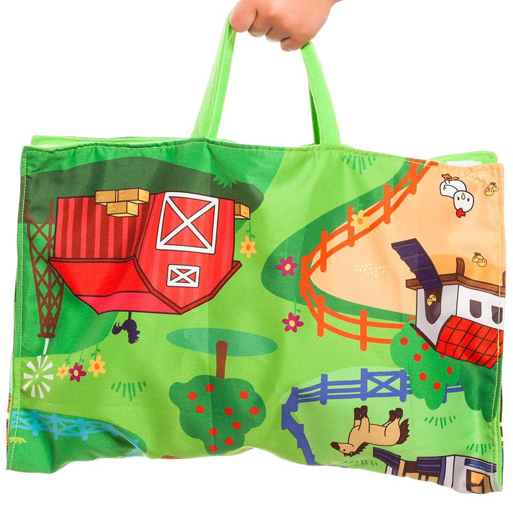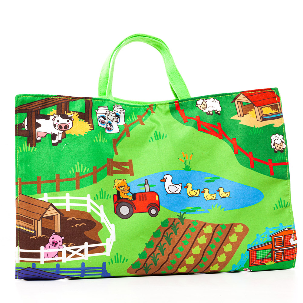 Tapiz de juego de tela con el dibujo de tu granja, con Lily, Marc y sus 7 animales, coloca a cada animal en su espacio, aprende sus nombres, toca y experimenta con sus diferentes sonidos y colores y una vez que termines recoge tus juguetes en el mismo tapiz que se convierte en bolsa.